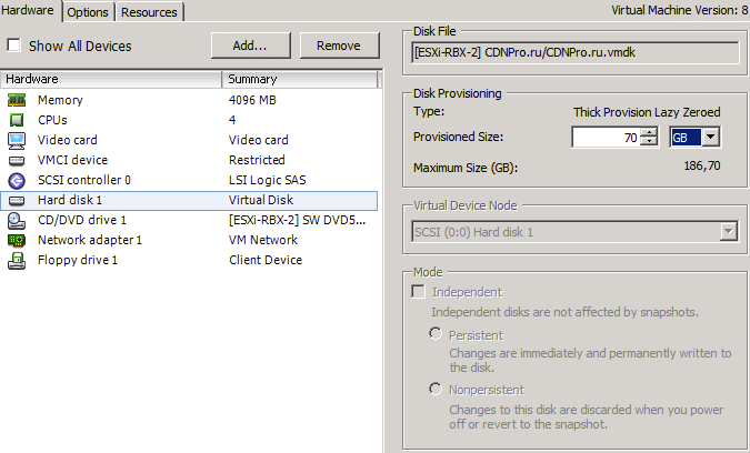 Для этого в клиенте VMWare vSphere найдем нужную виртуальную машину и в настройках Hard Disk 1 и в поле Provisioned Size укажем новый размер виртуального диска (60 Gb)