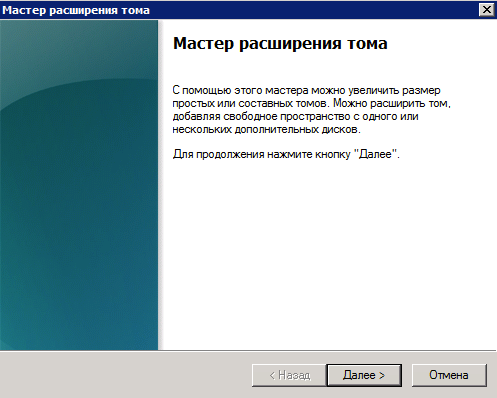 Выбираем диск, который будем увеличивать (в нашем случае C:/) и запускаем мастер расширения дискового пространства.