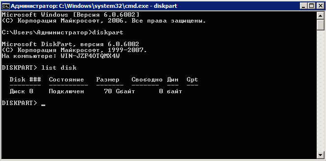 diskpartВыбираем необходимый диск
