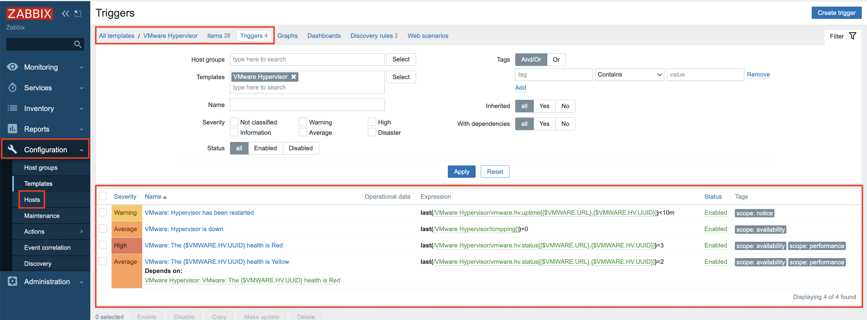 - Переходим в раздел «Triggers» в разделе «VMware Hypervisor».