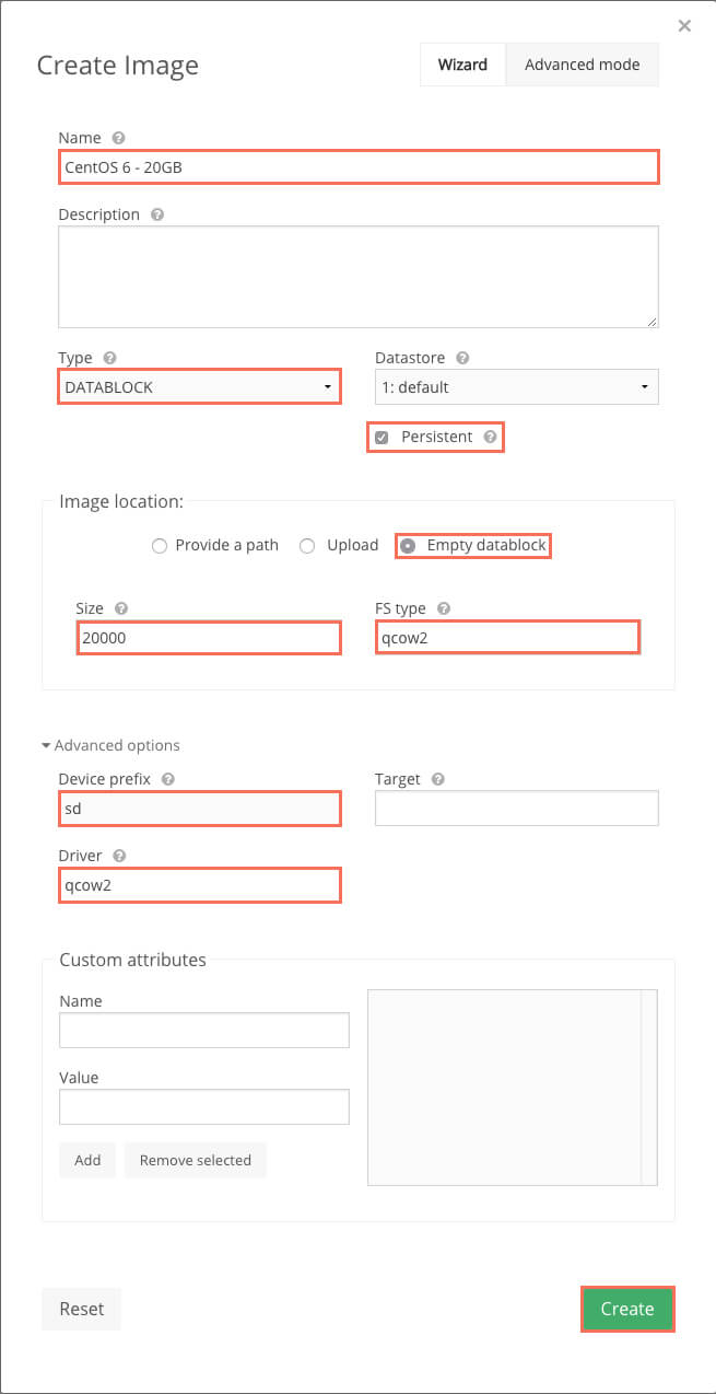Устанавливаем раздел выбранного блока в Mb, например 20Gb - 20000, префикс sd, а также тип и драйвер qcow2.