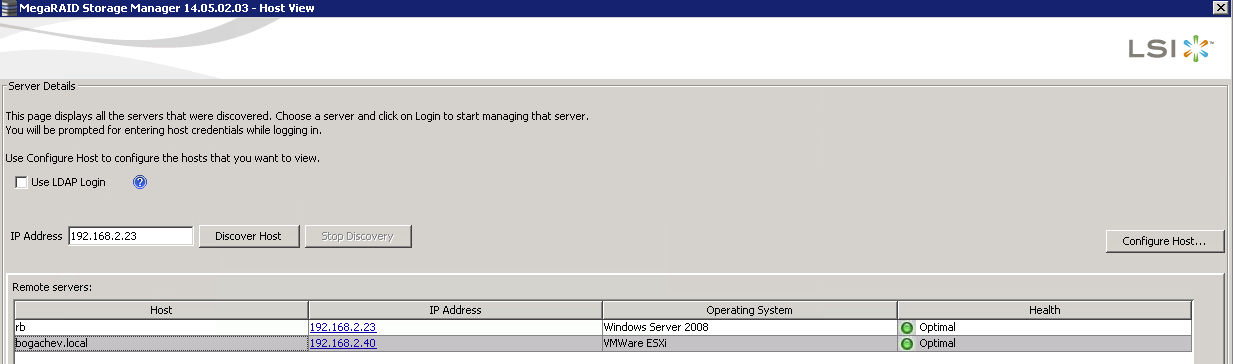 Запускаем MegaRAID Storage Manager. Нажимаем Configure Host и выбираем Display all the systems in the network of local server.