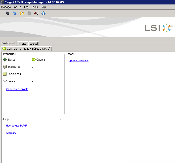(На скриншоте не собран RAID, поскольку задача была в установке и запуске MegaRAID Storage Manager)
